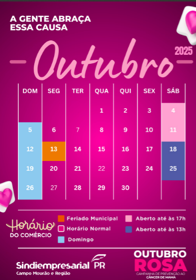 Amanhã começa outubro, e com ele duas pautas importantes para Campo Mourão: a campanha Outubro Rosa e os preparativos para o feriado de aniversário da cidade. Pensando nisso, o Sindiempresarial reforça as principais informações sobre o funcionamento do comércio no próximo mês e convida a comunidade a participar ativamente desse período de conscientização e planejamento.