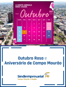 Organize-se com Antecedência e Valorize o Comércio Local Amanhã começa outubro, e com ele duas pautas importantes para Campo Mourão: a campanha Outubro Rosa e os preparativos para o feriado de aniversário da cidade. Pensando nisso, o Sindiempresarial reforça as principais informações sobre o funcionamento do comércio no próximo mês e convida a comunidade a participar ativamente desse período de conscientização e planejamento. 🎀 Outubro Rosa: A gente abraça essa causa! O Outubro Rosa é muito mais do que uma campanha de saúde — é um movimento de cuidado, prevenção e empatia. Neste mês, o Sindiempresarial reafirma seu compromisso com a conscientização sobre o câncer de mama, apoiando ações que orientam e incentivam as mulheres a realizarem exames preventivos e cuidarem de si com carinho. 📅 Horários do Comércio em Outubro Para que consumidores e lojistas se organizem com tranquilidade, o Sindiempresarial divulga os horários especiais de funcionamento para o mês de outubro: ✅ Sábados 04 e 11 – aberto até 17h✅ Sábados 18 e 25 – aberto até 13h❌ Domingos – fechado📅 Demais dias úteis – funcionamento normal🚫 Feriado